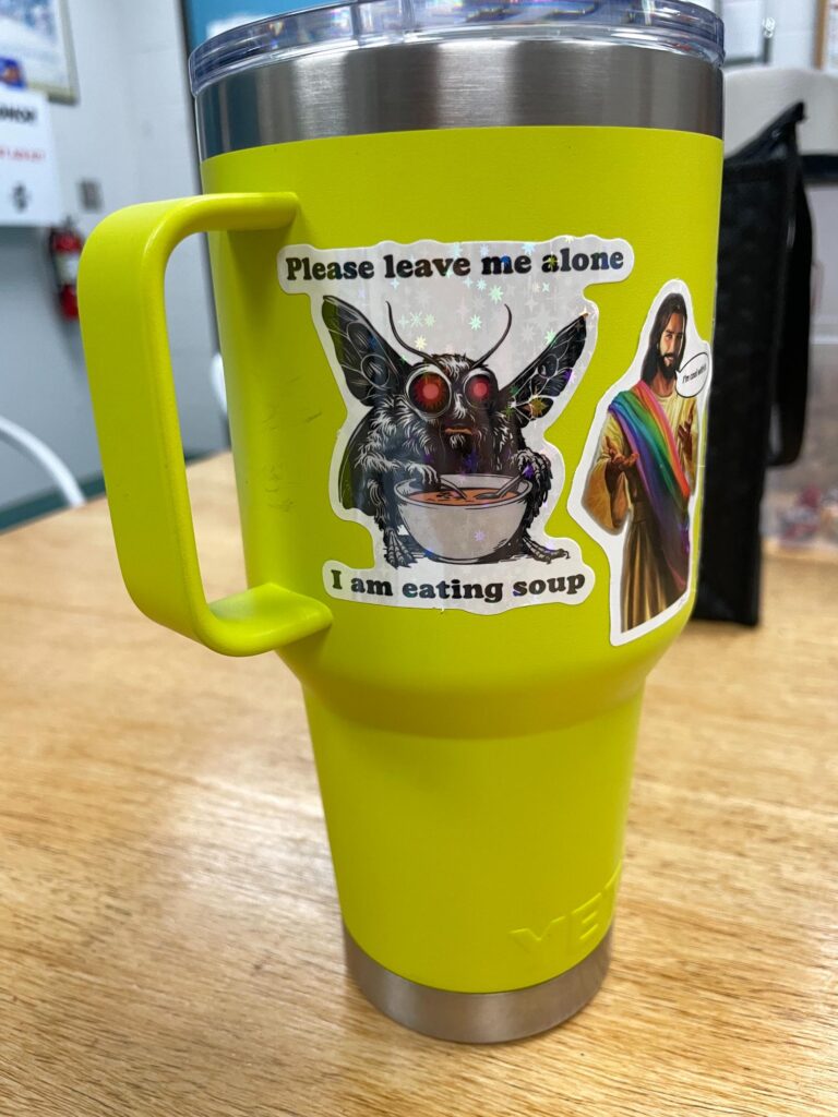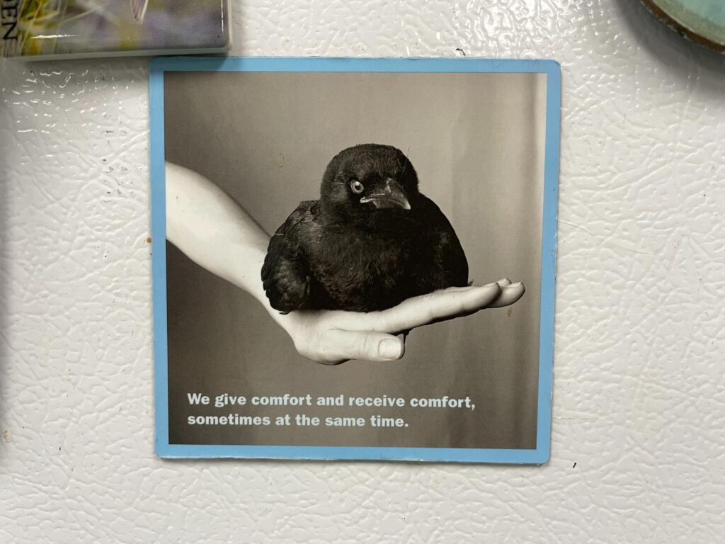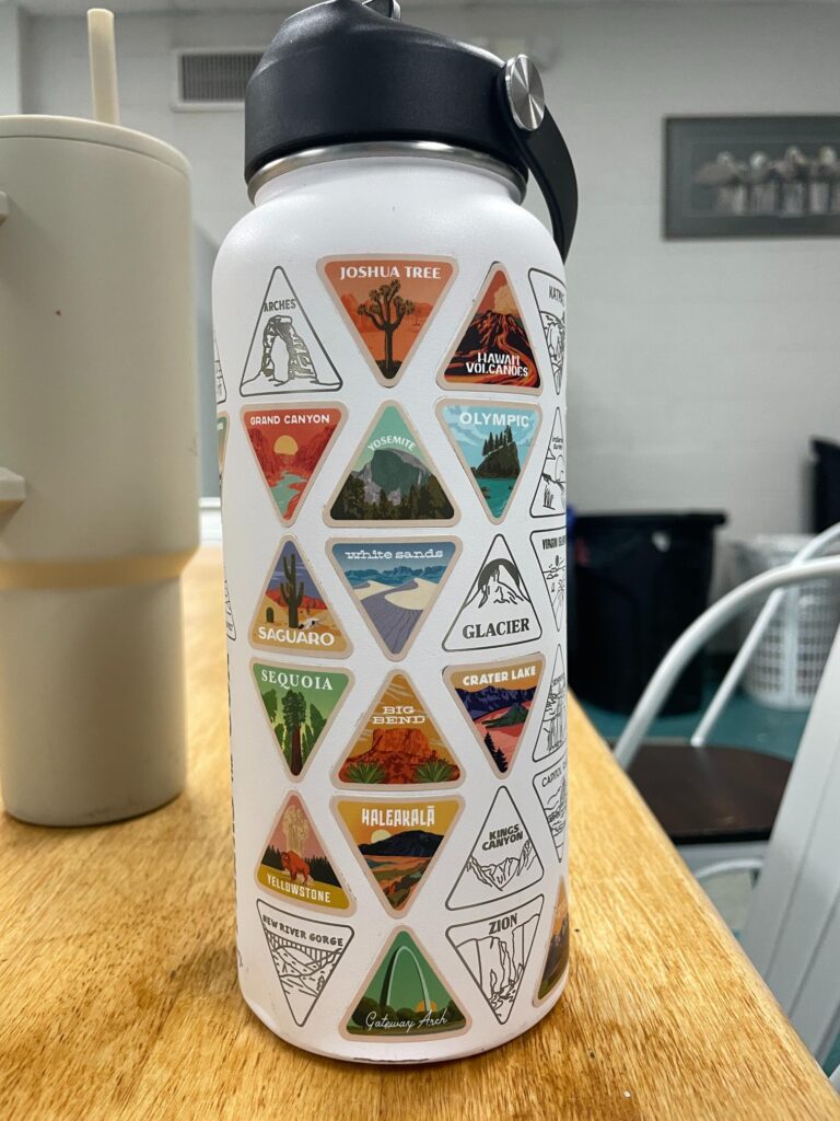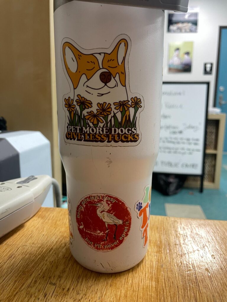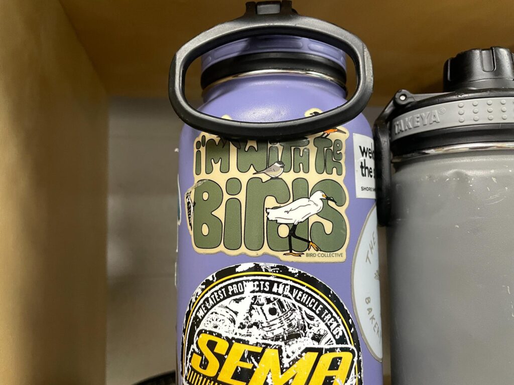It’s honestly mostly plants. Some views. Birds, obvi. A small montage of stickered water bottles left in the break room from volunteers and staff at IBR, along with a few cheeky magnets on the break room fridge.
